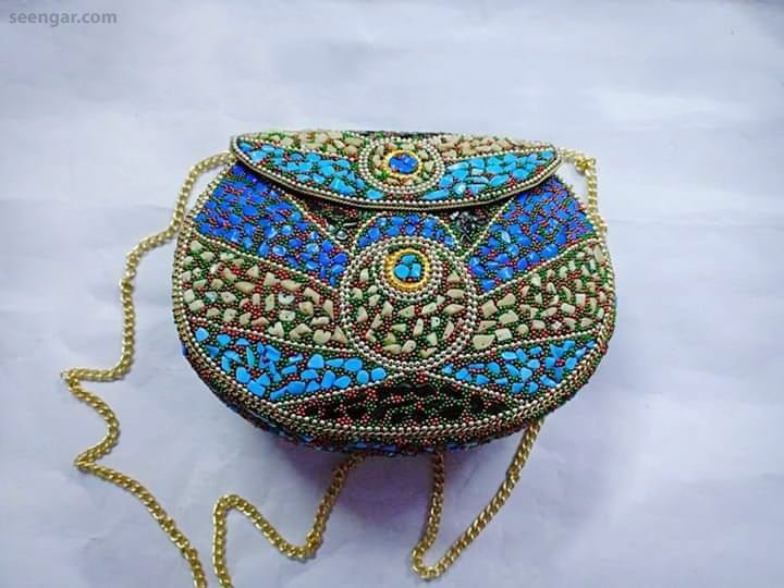 Our Mosaic clutch collection is made with hand from brass, metal and tiles. The inner portion is made of soft velvet along with the closing clips to make sure it is secure as well as the 42 inch strap. We have various colors and design which can be seen from the category. The length of the clutch is 7 inches and 5 inch wide.