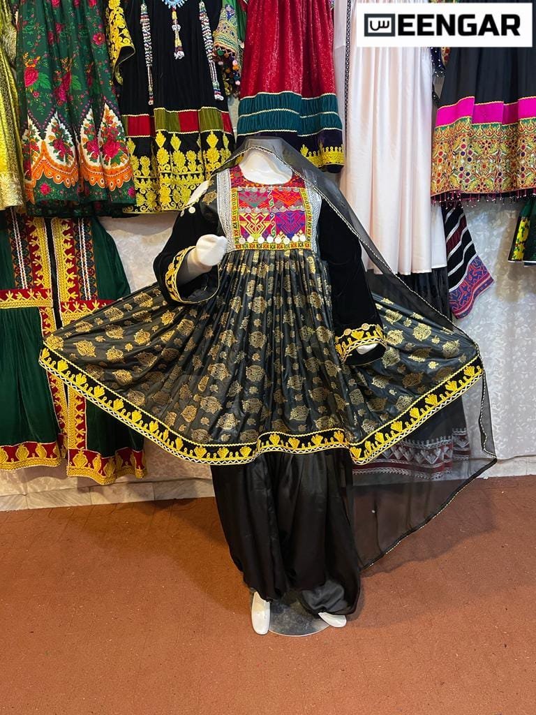 This traditional Afghani dress comes with a tie and dye dupatta, that offers all the gorgeous colors and thread works seen on the body of the dress. In addition, the dress features full sleeves with small mirror working, and thread detailing paired with some hanging motis.