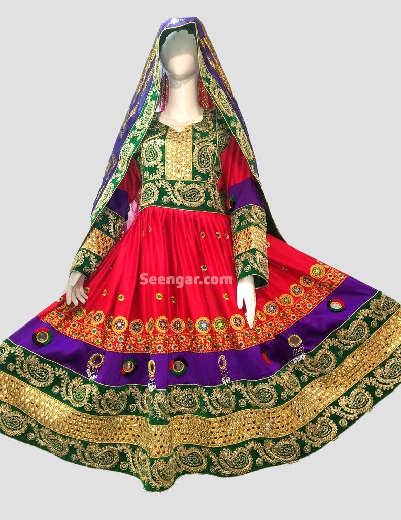 This marvelous red and green traditional Afghan dress is the perfect eid dress. As the full sleeved dress showcases the perfect shade of red, along with green and golden. Creating a stunning design that anyone would find it hard to look away from. The dress is filled with detailed thread and embroidered work from top to bottom, and comes with a matching Shawl (Dupatta). In addition, the touch of gold really makes the dress pop out and allows it to stand out a great deal.