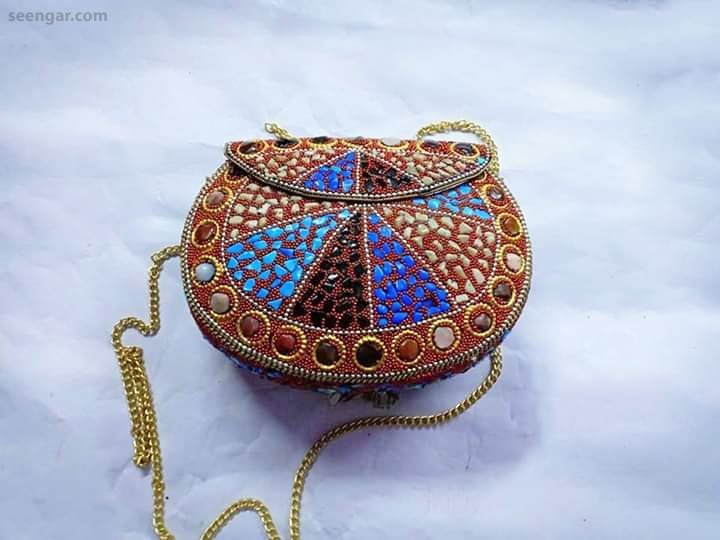 Our Mosaic clutch collection is made with hand from brass, metal and tiles. The inner portion is made of soft velvet along with the closing clips to make sure it is secure as well as the 42 inch strap. We have various colors and design which can be seen from the category. The length of the clutch is 7 inches and 5 inch wide.