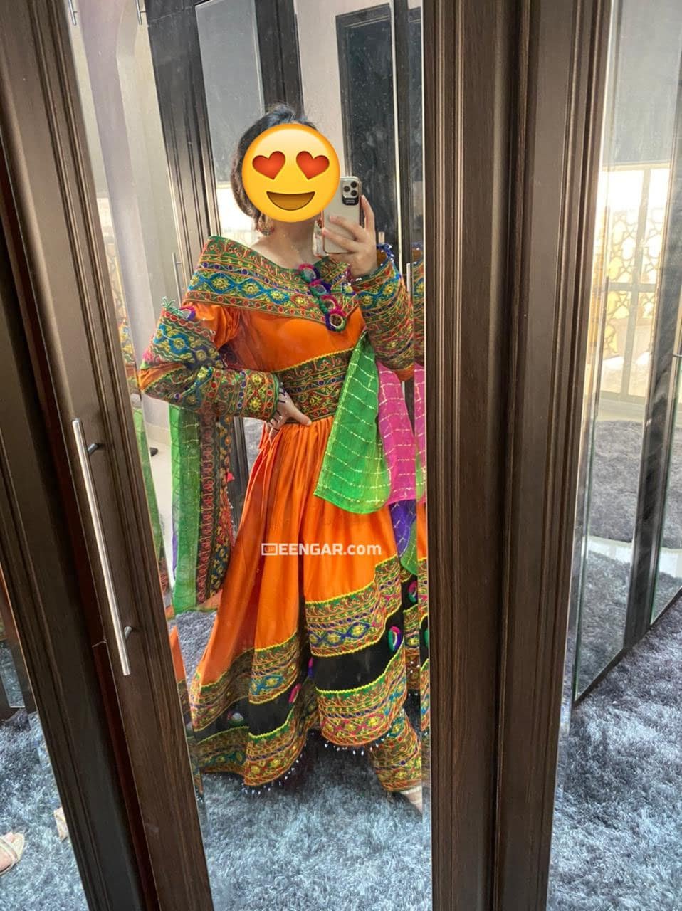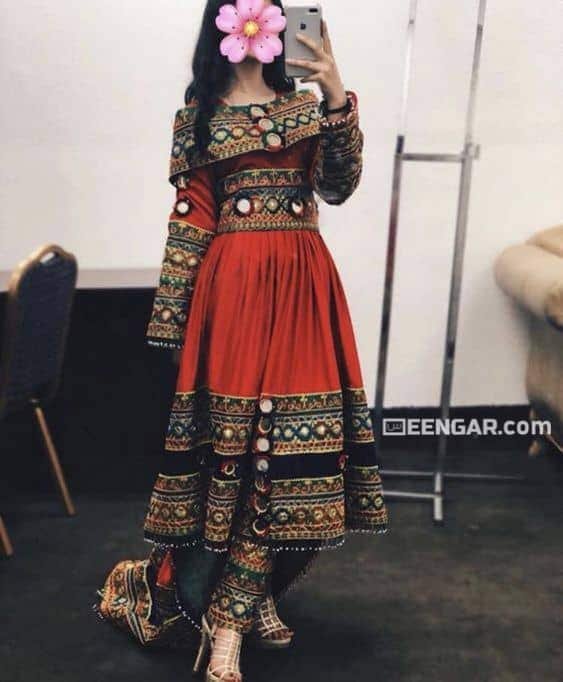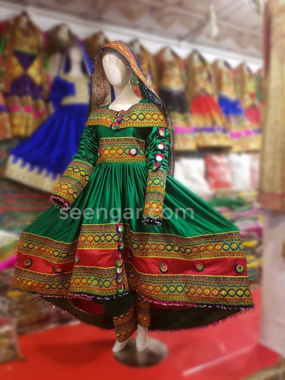 Garnet Afghan Kuchi Dress full of rich embroidery and mirror work ready to makes you stand out in the next events.