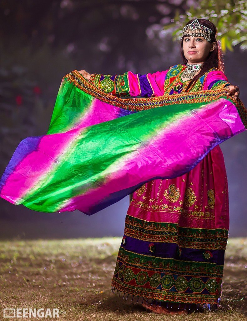 The freshness of the green and pink color is what helps this Afghan dress stand out from the rest. Which is paired with the perfect traditional threads and mirror work. This beautiful dress is the perfect fit for a wedding, as it is definitely an eye-catcher! The dabatta (shawl) showcases a tye and dye style, along with beautiful thread work on the border.