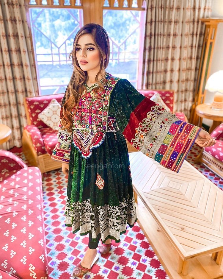 The dress has charming green sparkling colors with beautiful embroidery on top as we have on traditional Afghan Clothes, wide stylish sleeves and green matching pant. You will get a matching Dupatta or your choice color.