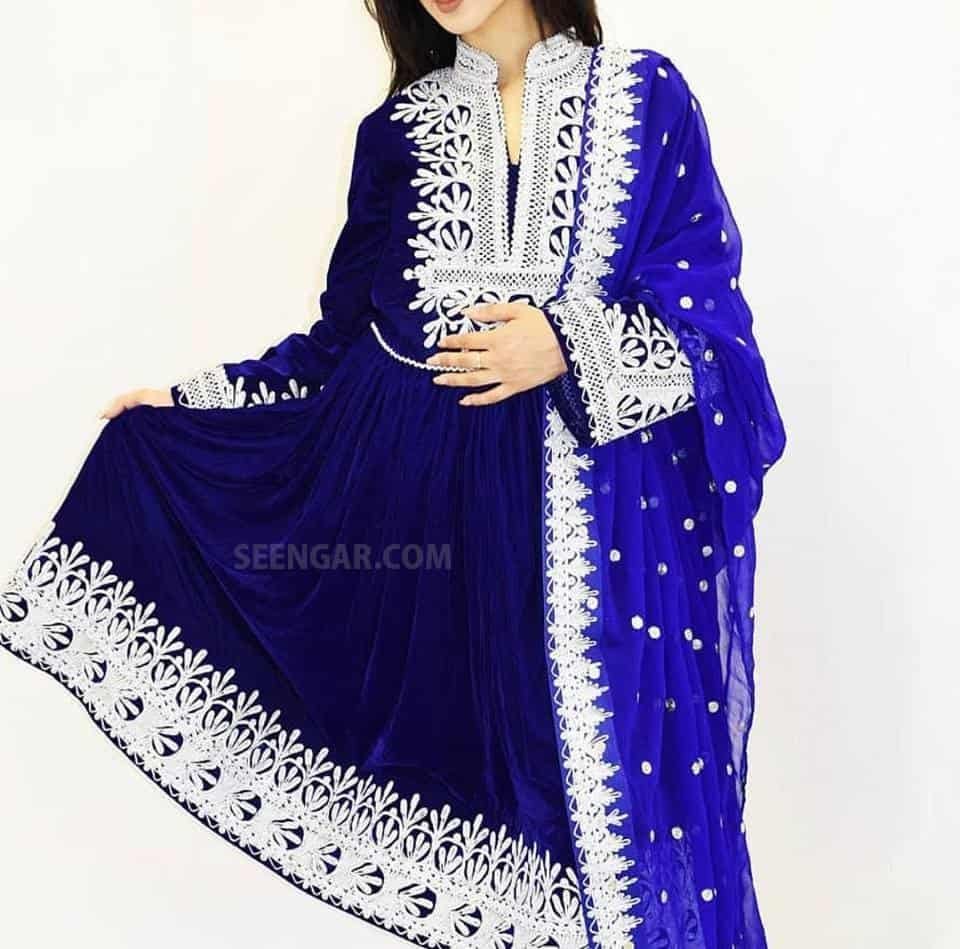 Navy Blue Velvet Dress is ready to makes you stand out in your next event. Vibrant blue colors with beautiful white embroidery known as Charma. The dress is available in different colors which can be mentioned in the notes.