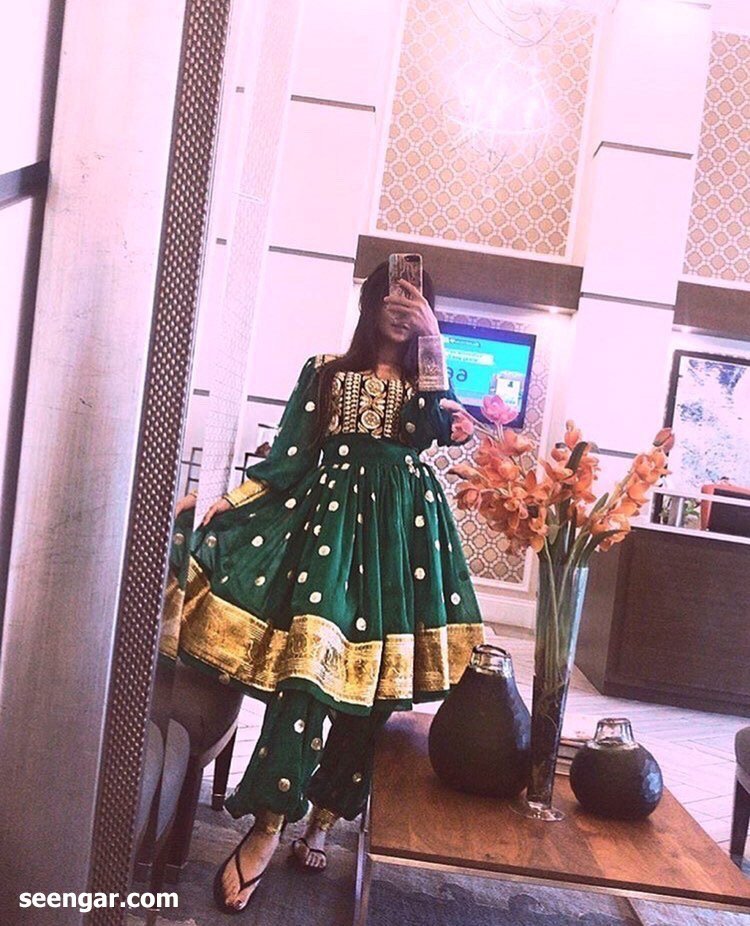 Pine Green Afghan Dress is made of lite net perfect for summer. It has golden embroidery on sleeves, shirt & paint cuffs.