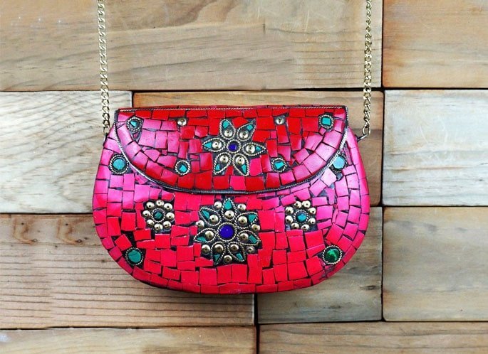 Our Mosaic clutch collection is made with hand from brass, metal and tiles. The inner portion is made of soft velvet along with the closing clips to make sure it is secure as well as the 42 inch strap. We have various colors and design which can be seen from the category. The length of the clutch is 7 inches and 5 inch wide.