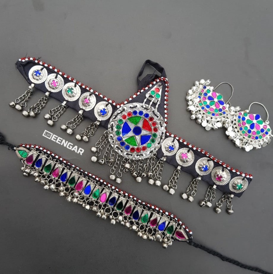 This Afghan Jewelry Set is lite weight filled with coins on the math Patti along with matching earrings and necklace.