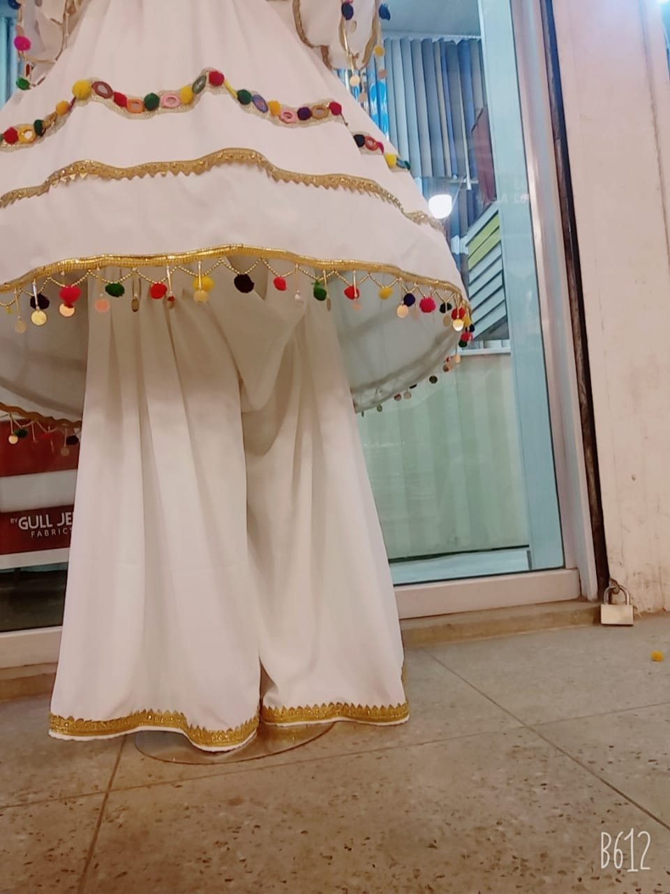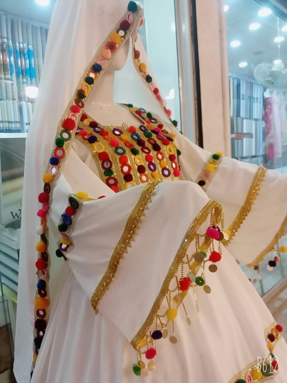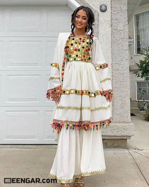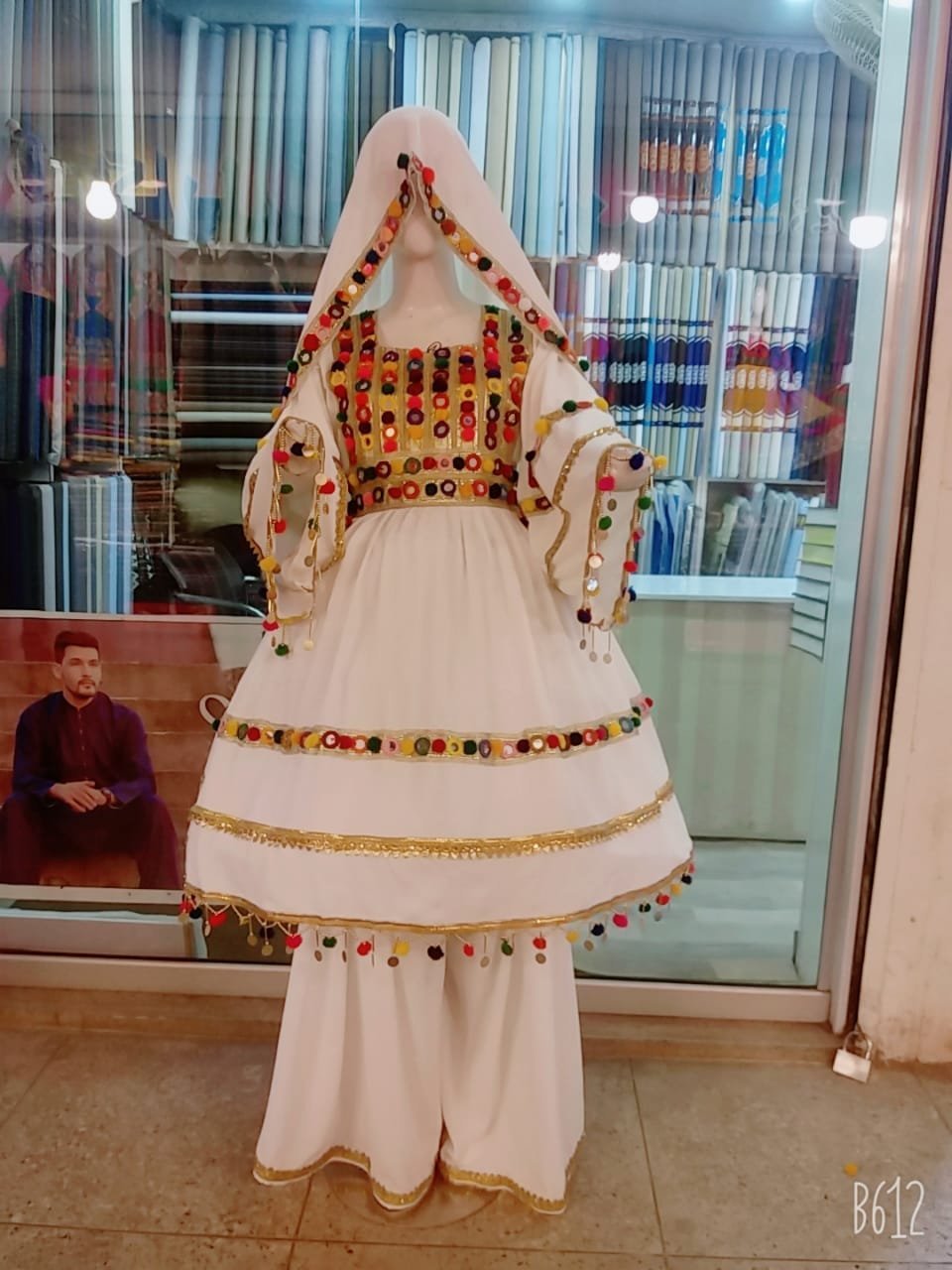 This White Afghan Dress is made for Spring with colorful flowers and white color. It has a slight touch of modern clothing which makes the shirt a bit short and stylish.