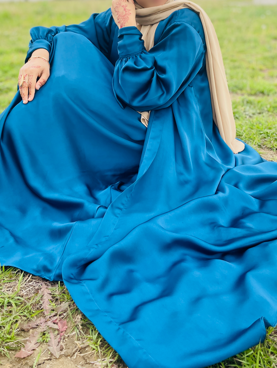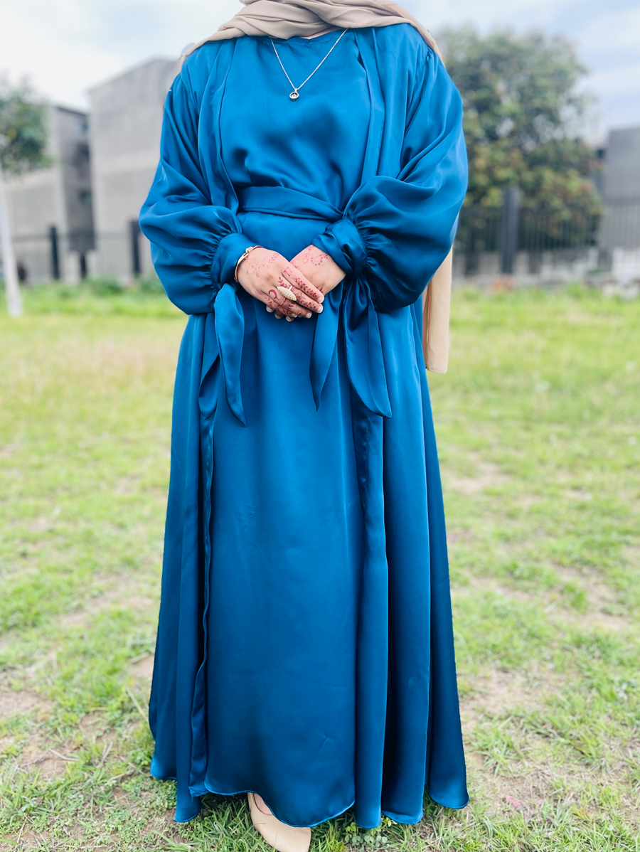 Tie Sleeve Open Abaya Satin Silk 3 piece Abaya is designed to bring elegance and versatility to your wardrobe. This enchanting abaya, with its captivating flow and graceful silhouette, is crafted for those who appreciate timeless beauty. The luxurious fabric shimmers delicately in the light, adding a touch of glamour to any occasion. Order now and indulge in pure sophistication.